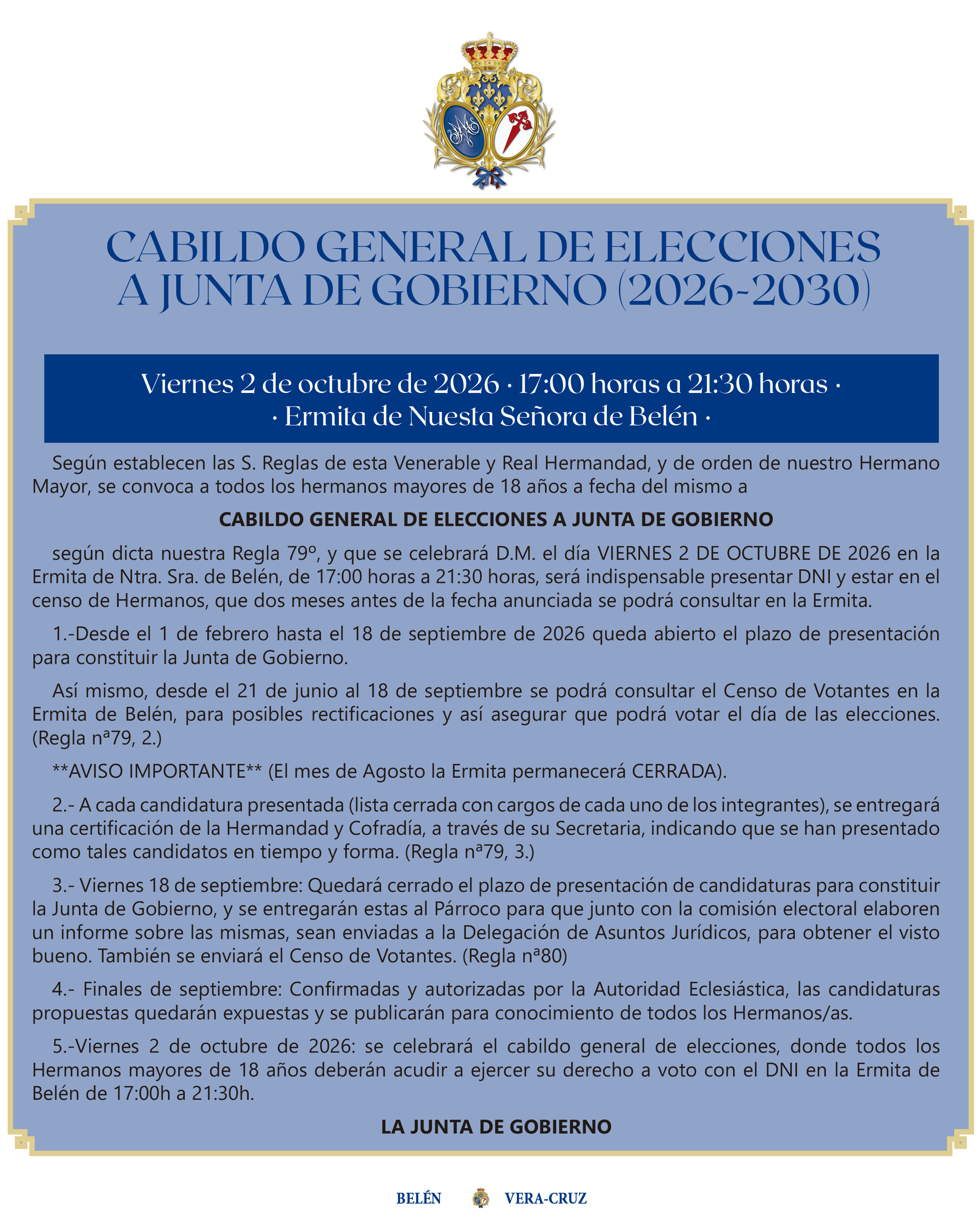 Según establecen las S. Reglas de esta Venerable y Real Hermandad, y de orden de nuestro Hermano Mayor con el VºBº del Señor Cura Párroco y del Delegado de Asuntos Jurídicos, se convoca a todos los hermanos mayores de 18 años a fecha del mismo a CABILDO GENERAL DE ELECCIONES A JUNTA DE GOBIERNO según dicta nuestra Regla 79º, y que se celebrará D.M. el día VIERNES 2 DE OCTUBRE DE 2026 en la Ermita de Ntra. Sra. de Belén, de 17:00 horas a 21:30 horas, será indispensable presentar DNI y estar en el censo de Hermanos, que dos meses antes de la fecha anunciada se podrá consultar en la Ermita.