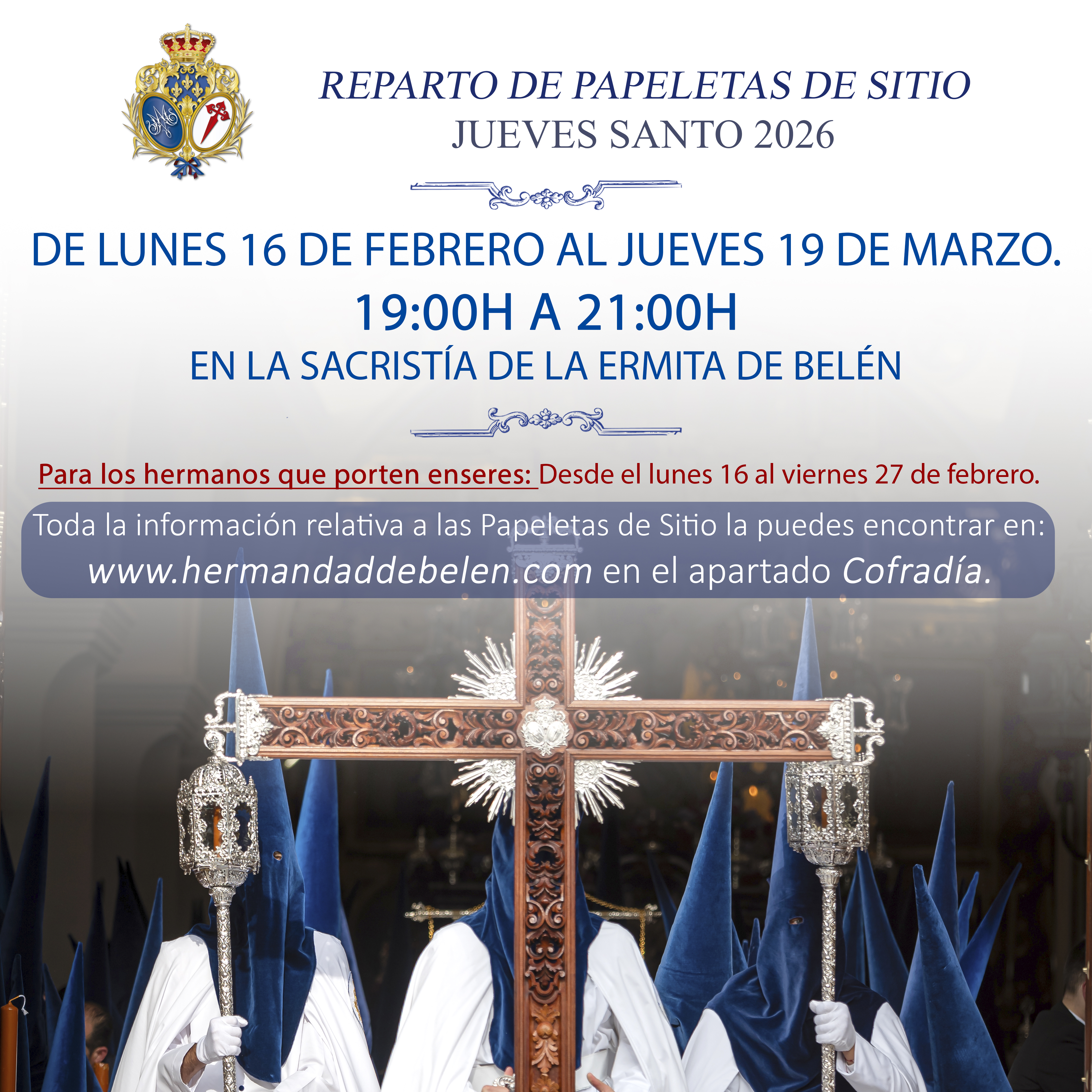 DATOS A TENER EN CUENTA:- Los participantes en la cofradía estarán citados en la Ermita de Belén a las 17:45h. - Aquellas personas mayores o impedidas que quieran presenciar la salida desde las sillas habilitadas en el porche deberán estar entre las 18:30h y 18:50h en la puerta principal de la Ermita de Belén.