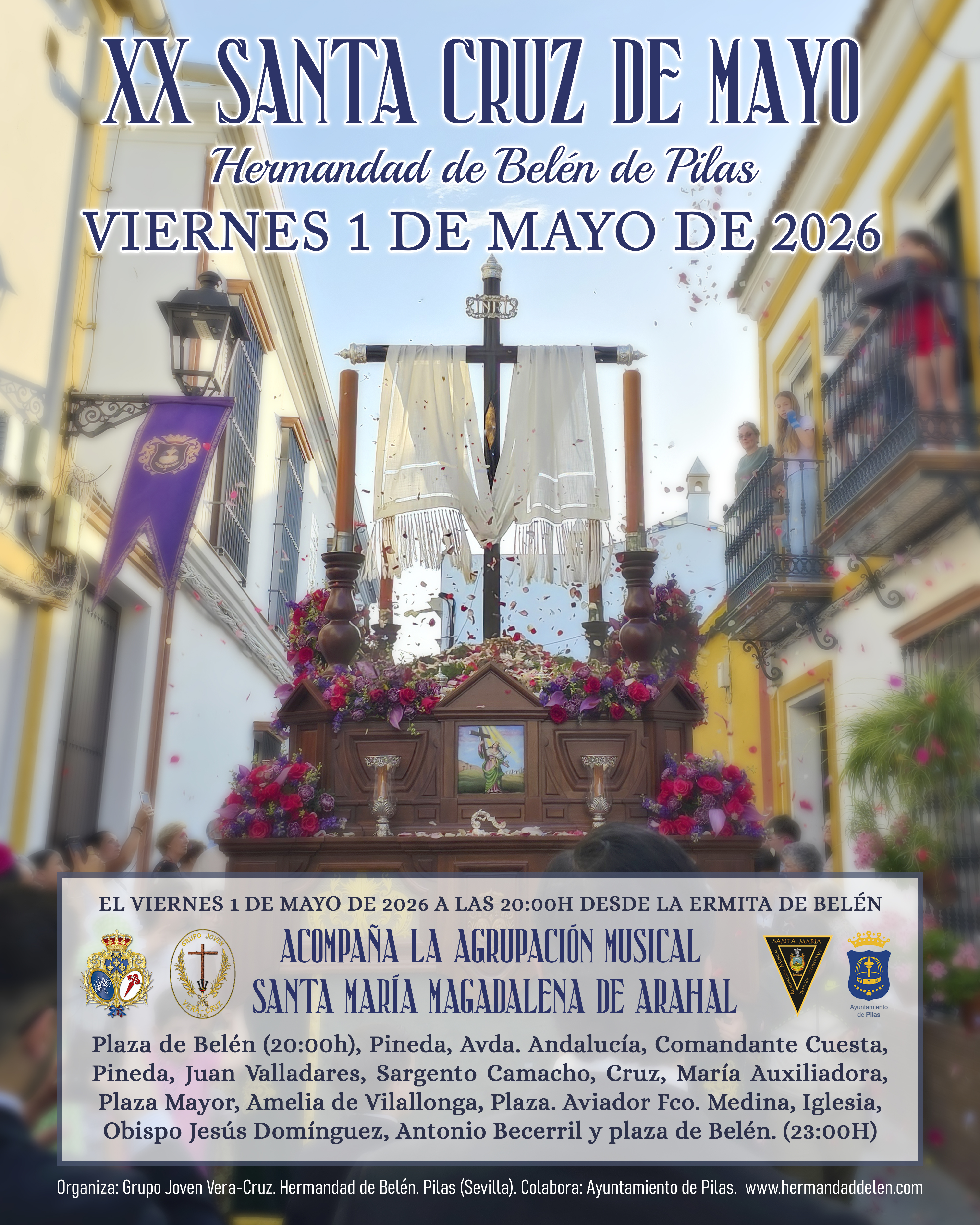 El viernes 1 de mayo de 2026, a las 20:00h, desde la Ermita de Belén, tendrá lugar la vigésima salida procesional de la Santa Cruz de Mayo que organiza el Grupo Joven Vera-Cruz.