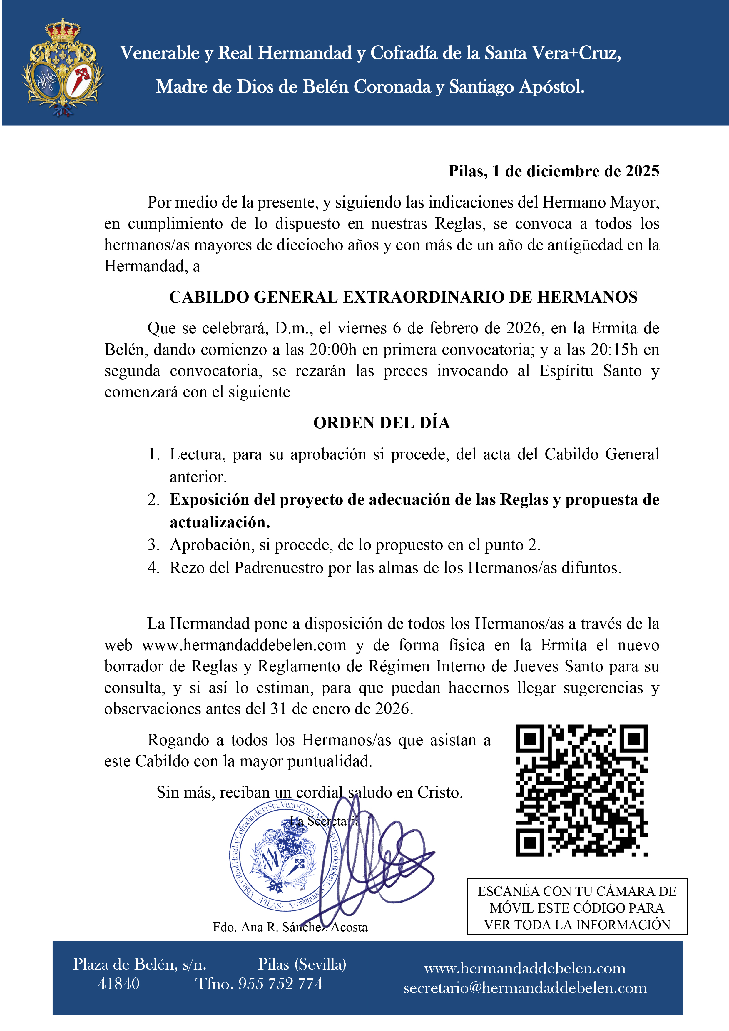 El Cabildo General de Hermanos Extraordinario para la aprobación, si procede, del proyecto de adecuación de las Reglas y propuesta de actualización tendrá lugar en la Ermita de Belén viernes 6 de febrero de 2026, al finalizar la Santa Misa de Novena.